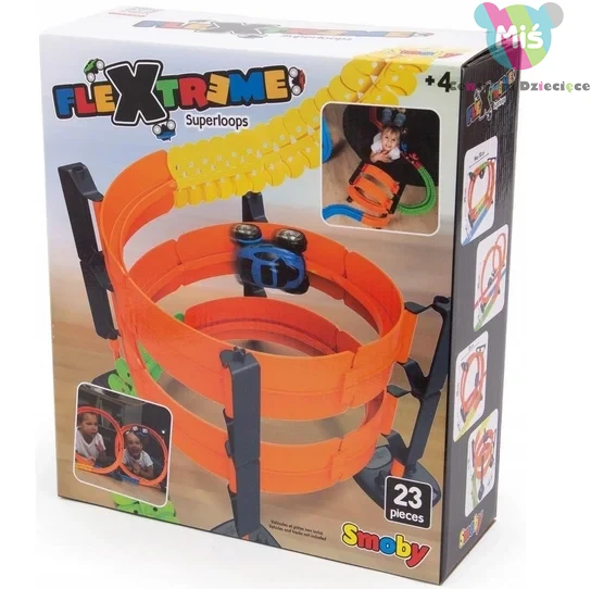 FLEXTREME Zestaw super pętli Zestaw 2 super pętli do zwiększenia atrakcyjności zabawy torami Flextreme. Pętle mogą być instalowane osobno lub razem, ustawione pionowo lub poziomo. Wymiary opakowania: 32 x 10,5 x 28 cm, 4 l+