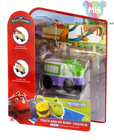 Lokomotywa Koko z napędem - wystarczy dotknąć dachu lokomotywy, aby uruchomić mechanizm. Ponowne dotknięcie zatrzyma ciuchcię, Lokomotywa może jeździć po torach, jak i poza nimi, Kolejka kompatybilna z większością zestawów Stacyjkowa, Odpowiedni dla dzieci powyżej 3 lat.