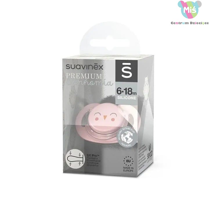 Fizjologiczny smoczek dla niemowlaka SX Pro silikonowy marki Suavinex z motywem różowej sowy.